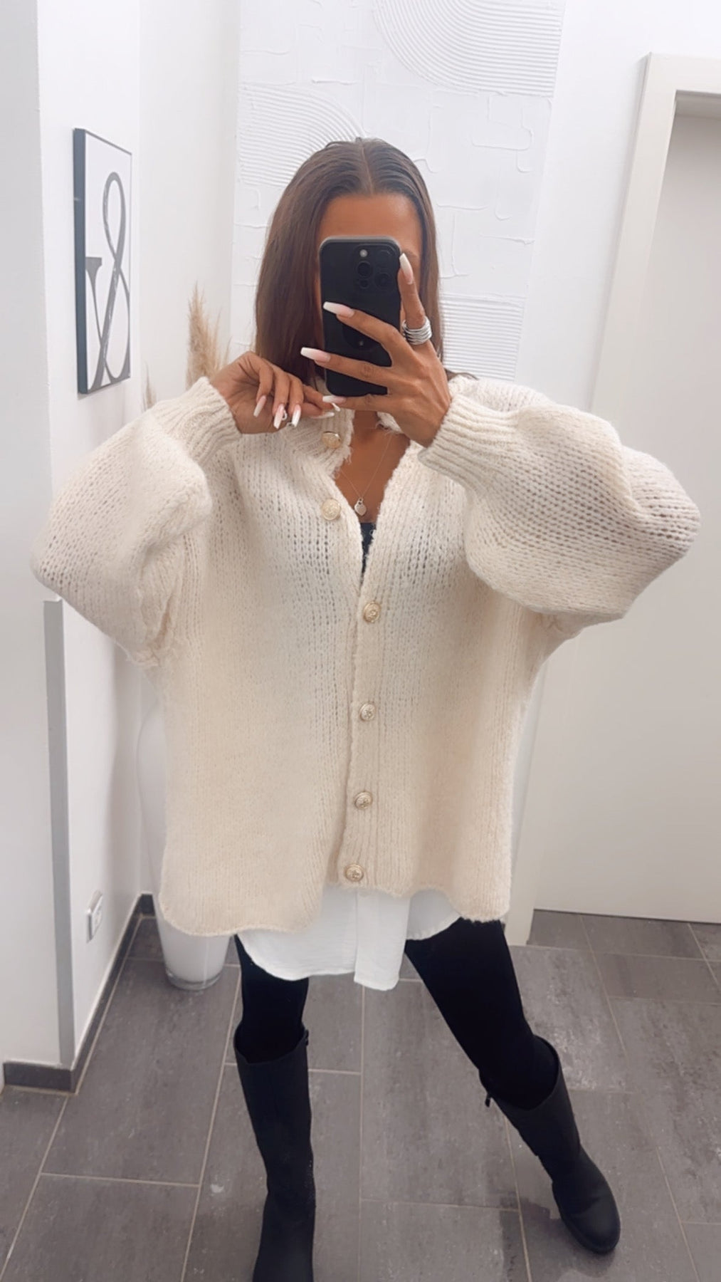 - Elegant golden buttons that enhance the cardigan’s refined appeal
